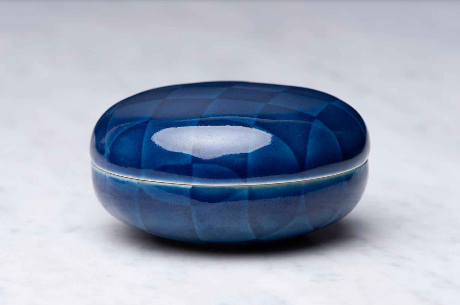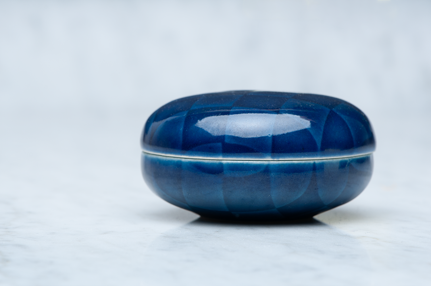 Material: Gjutet stengods med en mörkblå blank glasyr.