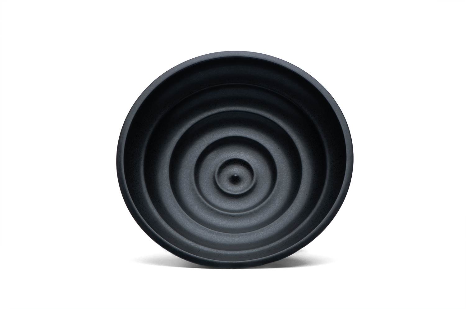 Gjutet fat i stengods med vågformad relief på insidan. Svart matt glasyr.