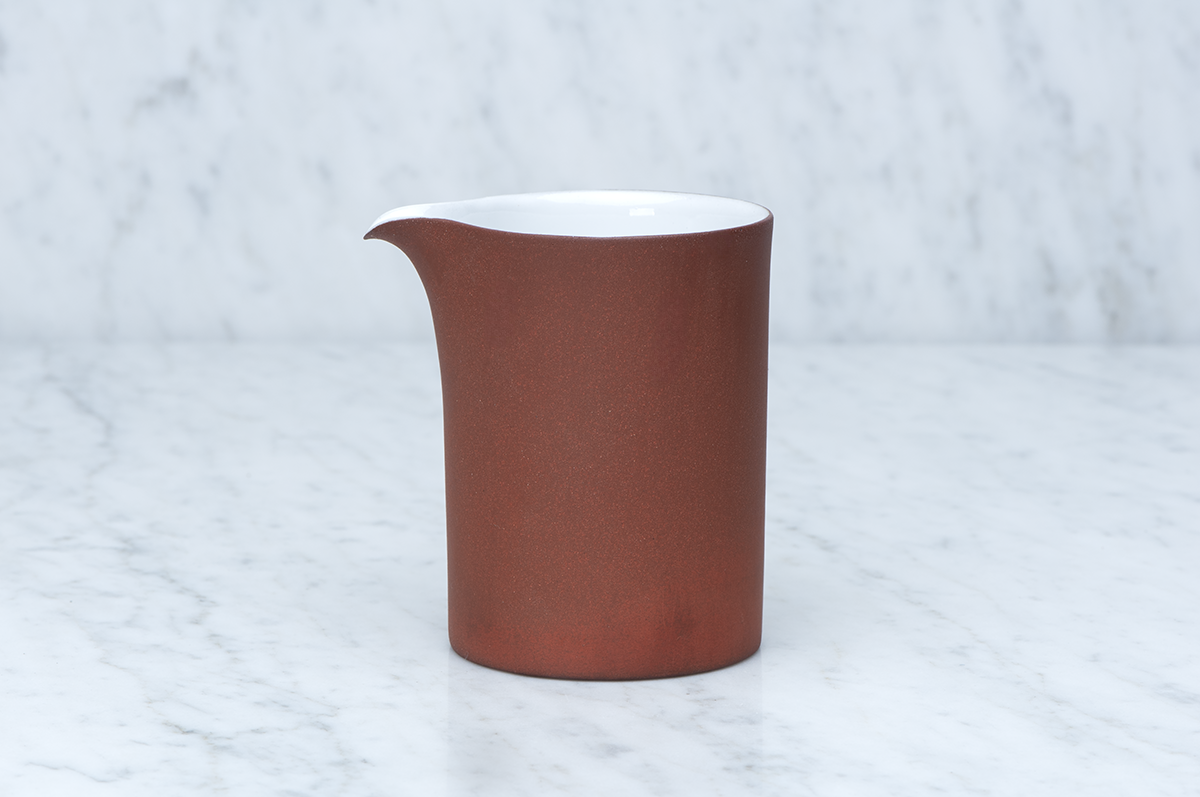 Kanna i gjuten brun stengodslera. Oglaserad utsida med vit blank glasyr på insidan. En variation i den bruna färgen kan förekomma.