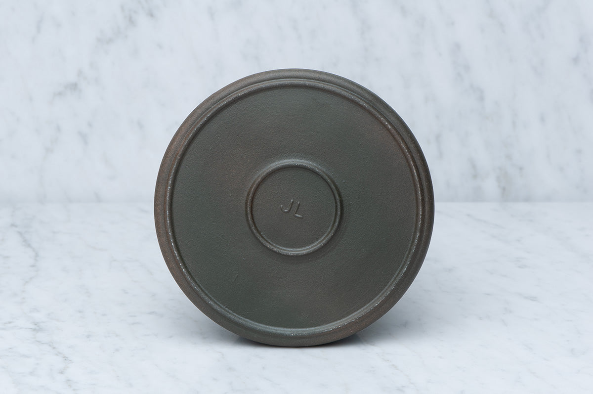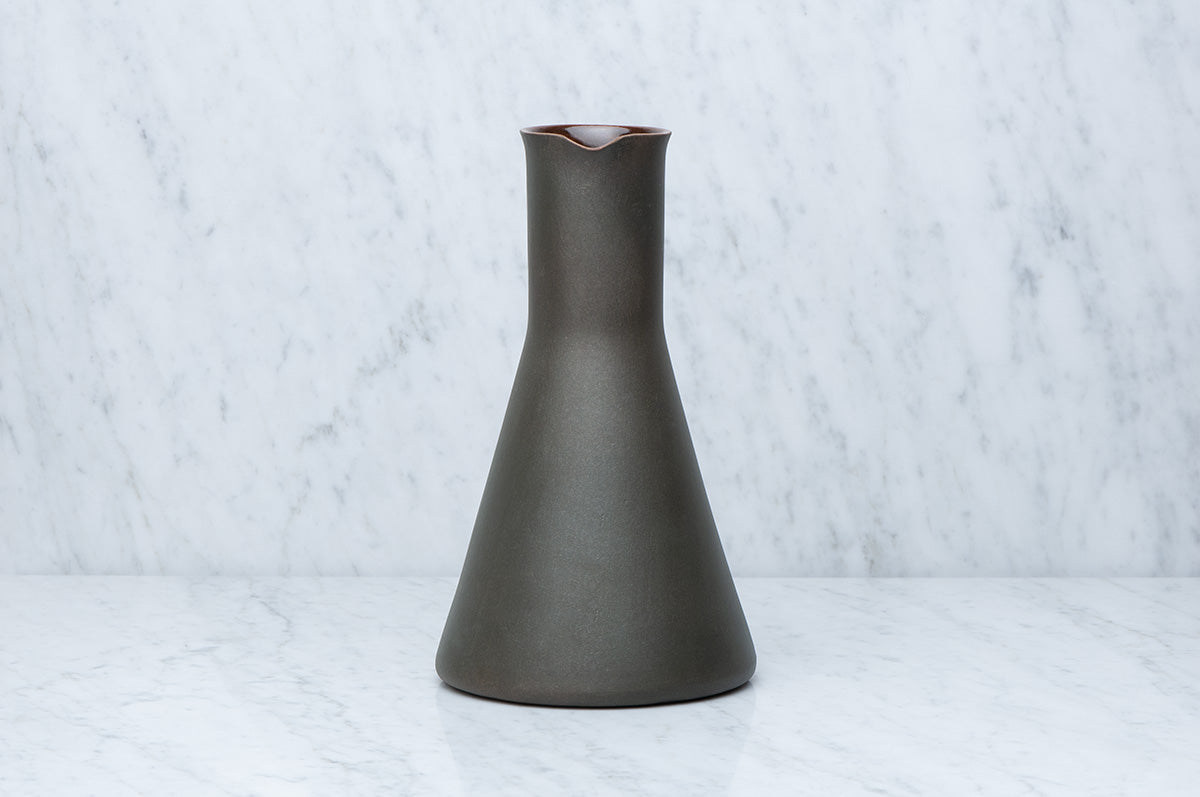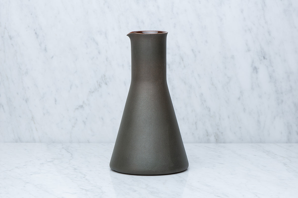 Karaff i gjutet stengods. Blank brun glasyr på insidan och en tunn sidenmatt mörkgrön glasyr av Terra Sigillata på utsidan.