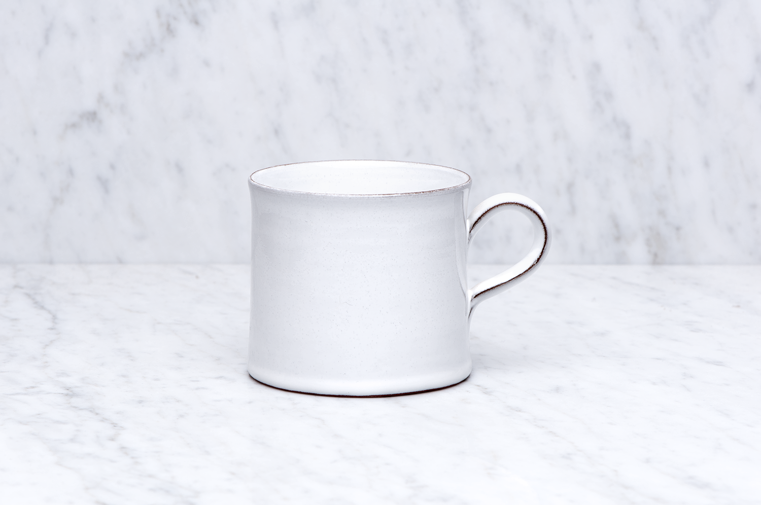 Handdrejad mugg i röd stengodslera med vit blank glasyr.