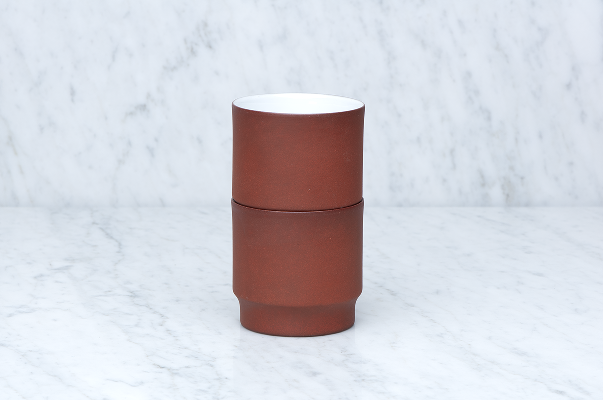 Stapelbar mugg i gjuten brun stengodslera. Oglaserad utsida med vit blank glasyr på insidan. En liten variation i den bruna färgen kan förekomma.