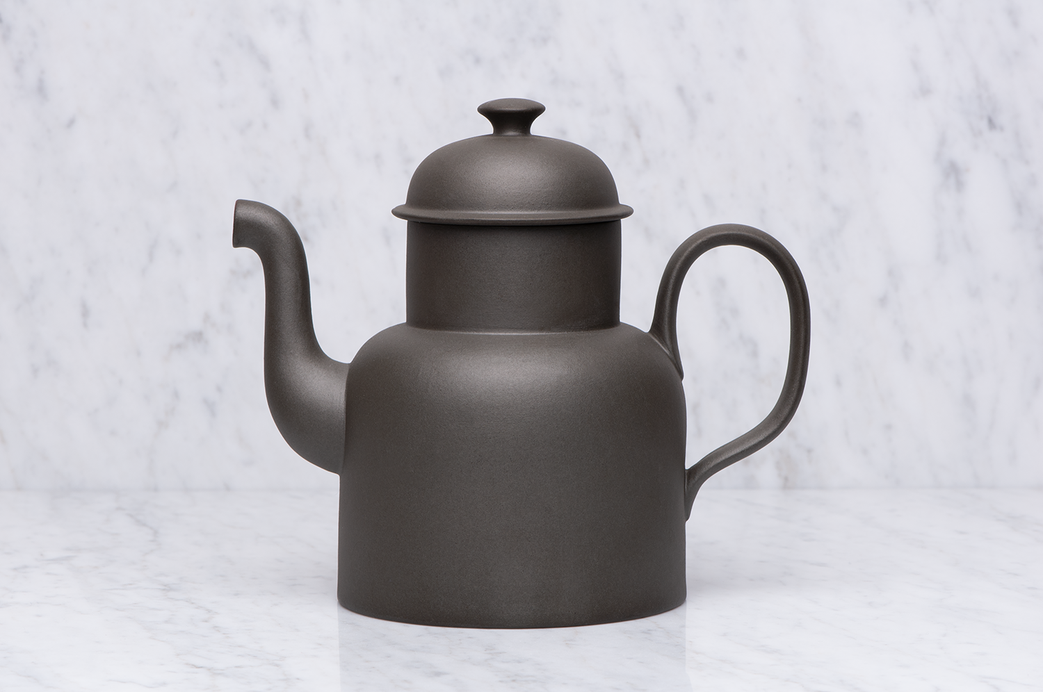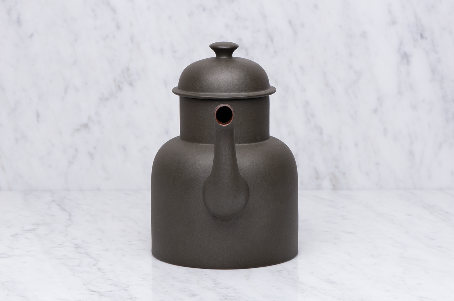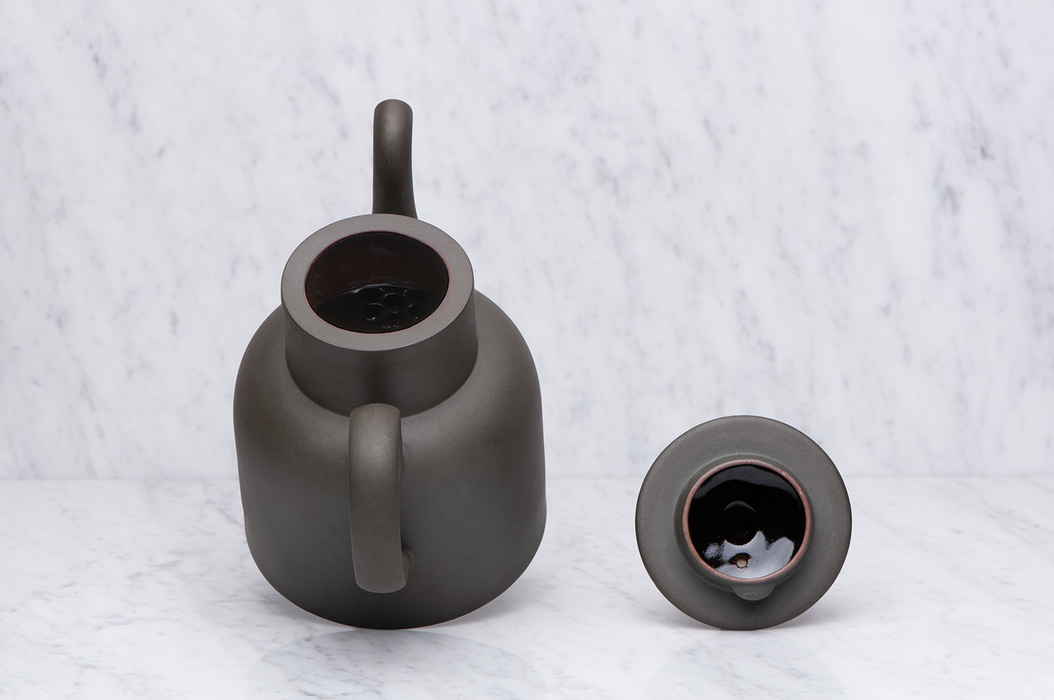 Tekanna i gjutet stengods. Blank brun glasyr på insidan och en tunn lerglasyr av Terra Sigillata på utsidan.